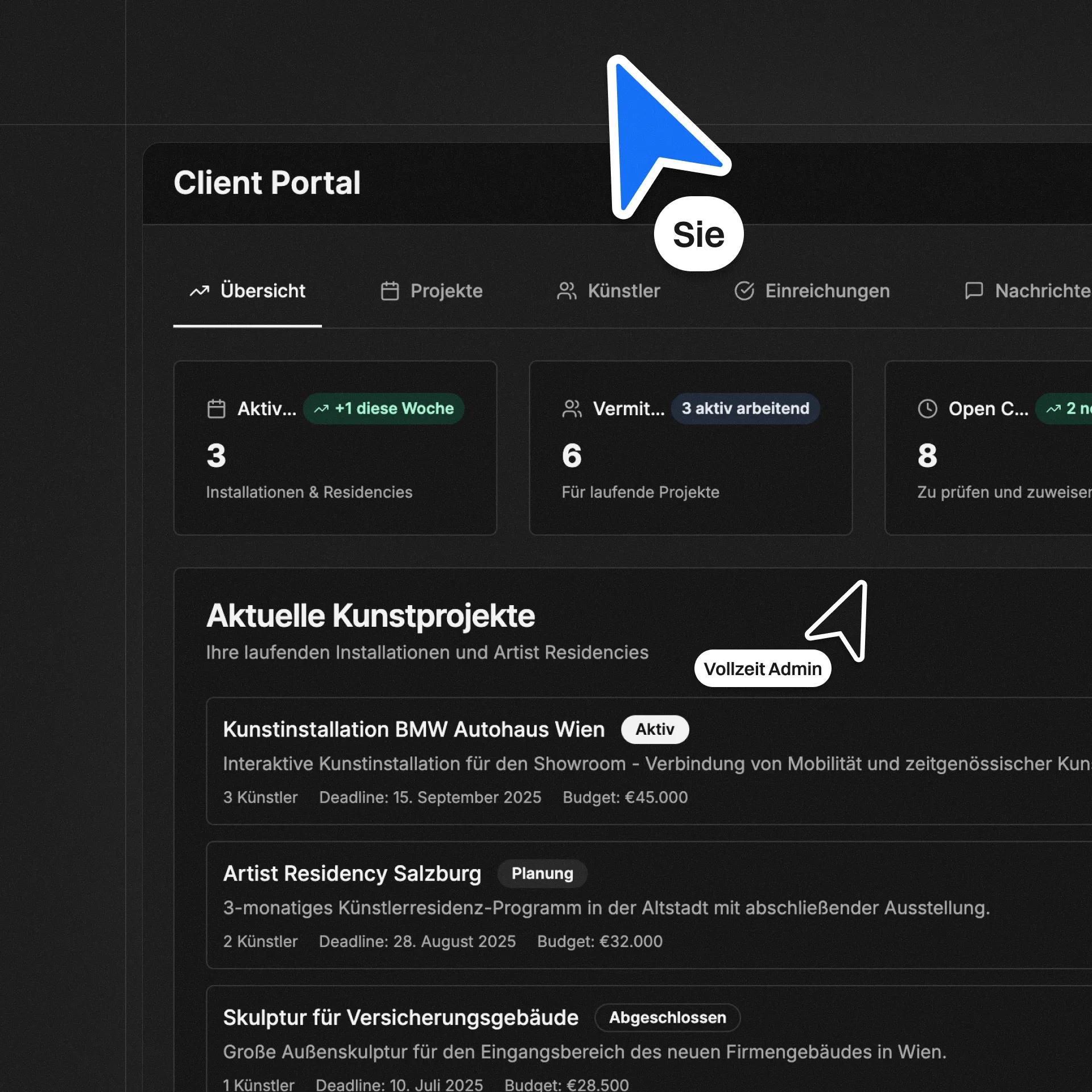 Unsere Plattform bildet nicht nur interne Prozesse ab, sondern schafft auch transparente Schnittstellen nach außen. Mit dem Client-Dashboard behalten Marken und Agenturen jederzeit den Überblick über Künstler*innen, Projekte und Statusupdates – klar strukturiert, sicher und in Echtzeit.